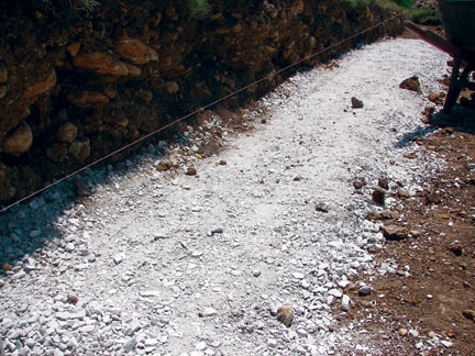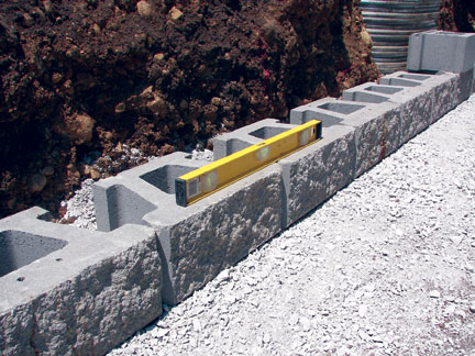 Excavate the base trench to the lines and grades indicated on the approved plans. The trench should be a minimum of 24” wide and 12” deep. The aggregate leveling pad is made of good quality compactable gravel such as road base or 3/4” crushed stone. The stone leveling pad should be a minimum of 6” thick and compacted to 95% Standard Proctor or higher.