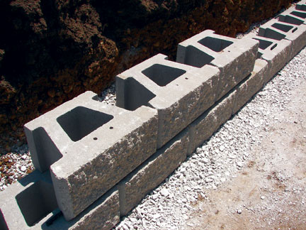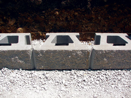 Begin placing the first course of Pinnacle units, starting at the lowest elevation of the wall. The Pinnacle units should be placed end to end with the channel of the unit facing down. Level each base block front to back and side to side. Make sure the first course of Pinnacle units are imbedded a minimum of 6” below finished grade in front of the wall.