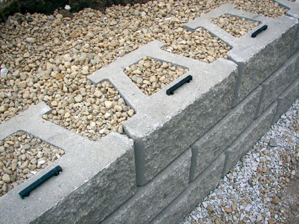 Sweep the tops of the Pinnacle course below to remove any stone or debris. Place the next course of units, fitting the PAC clips into the channel of the unit above. Make certain the units are installed in a running bond pattern. Pull the Pinnacle units toward the wall face until the unit engages the PAC clips. Continue installing backfill and additional courses to plan top of wall.